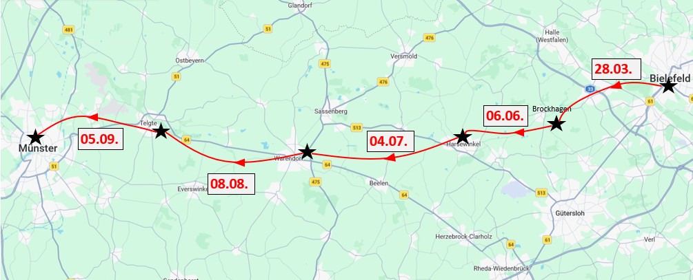 Wir gehen leichte Wege, im Teutoburger Wald können auch Steigungen dabei sein. Gutes Schuhwerk und zweckmäßige Bekleidung sind empfehlenswert. Bei unsicherem Wetter auch Regenzeug (Cape, Schirm, …).